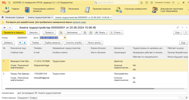Документ «Анкета трудоустройства» предназначен для ввода и хранения информации о трудоустройстве студентов и выпускников, а также об их планах относительно дальнейшего трудоустройства.