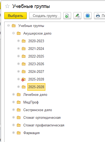 2. Нажать кнопку "Создать группу". Указать наименование, в поле "Группа учебных групп" выбрать специальность для которой создается группа