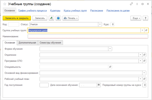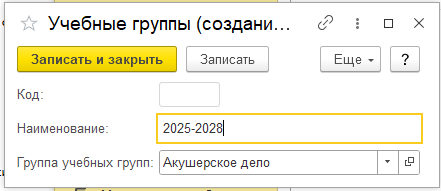 6. В открывшемся окне в поле "Группа учебных групп" выбираем ту группу которую создали, нажав на перевернутый треугольник и показать все. Заполнить поле "Наименование"