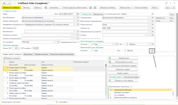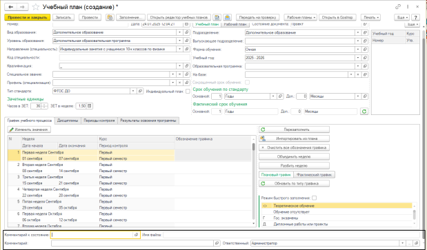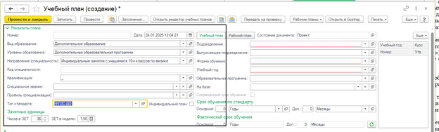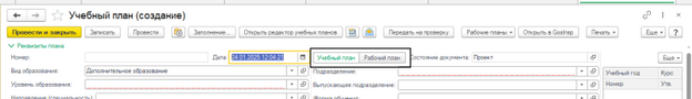 Поле «Дата» автоматически заполняется; при необходимости его можно редактировать. Поле «Номер» заполняется при записи или проведении документа. Кнопка в верхней части формы определяет тип учебного плана: