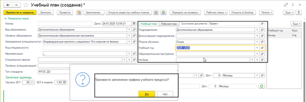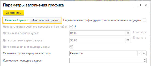 После заполнения учебного года появится диалоговое окно, в котором будет предложено перезаполнить график учебного процесса. Необходимо нажать «Да», после откроется форма с параметрами заполнения графика. Для заполнения графика необходимо нажать на кнопку «Выполнить».