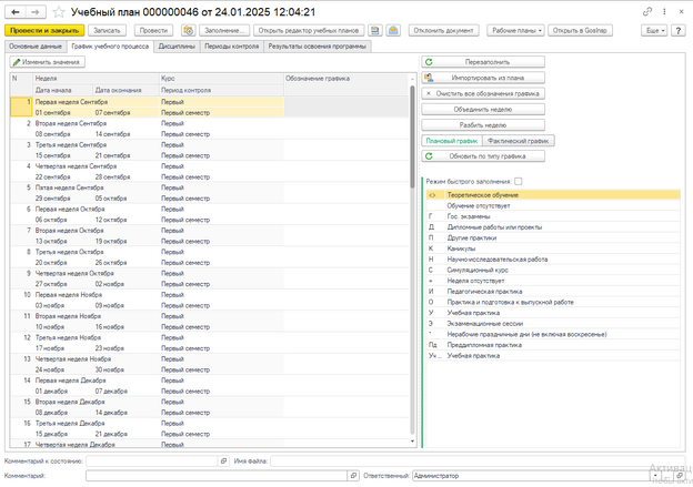 Форма документа «Учебный план» включает в себя вкладки «График учебного процесса», «Дисциплины», «Периоды контроля» и «Результаты освоения программы». Рассмотрим последовательно каждую из них.