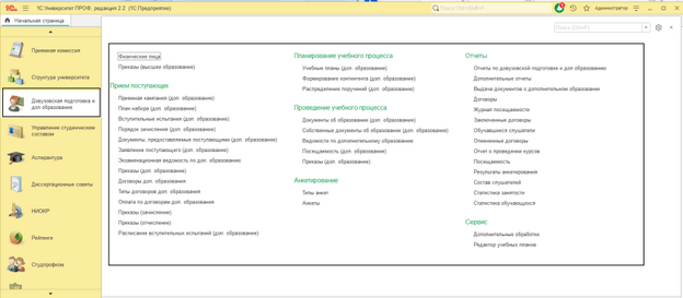 Обучение лиц, планирующих поступать в вуз, а также получение дополнительного образования для тех, кто имеет высшее образование. Для организации и выполнения данных функций в «1С:Университет ПРОФ» реализована подсистема управления дополнительным образованием и довузовской подготовкой.