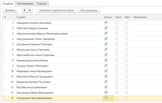4. После выбора группы студенты заполнятся автоматически. Нажимаем кнопку "Все допущены", чтобы у всех проставилась галочка в поле "Допуск"