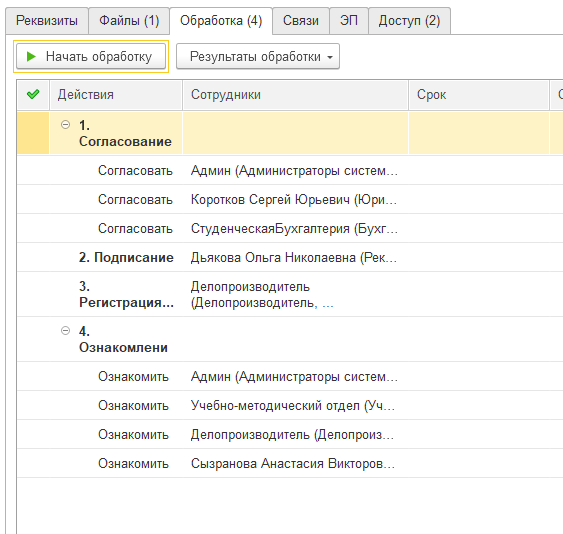 16. На вкладке "Обработка" нажимаем "Начать обработку". После чего прика пойдет на согласование и подписание по списку.