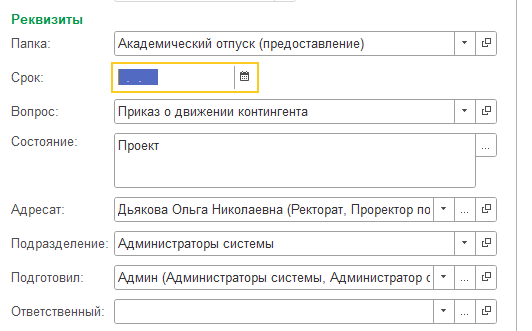 7. В поле "Срок" указываем дату, до которой должен быть подписан приказ.