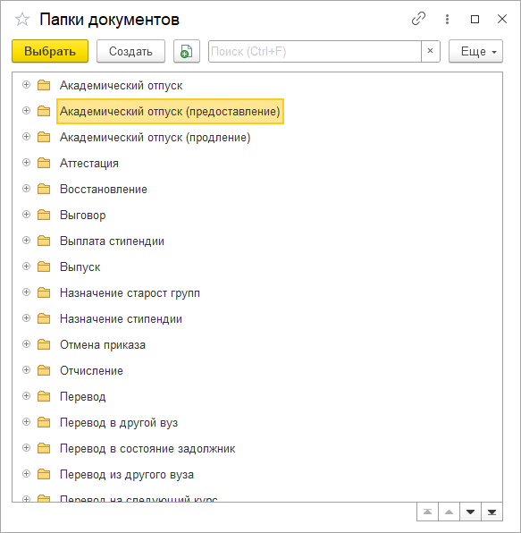 6. В открывшемся окне выбираем папку, соответствующую типу приказа из данного списка Список видов приказов и их причин. Если такого типа нет, то выбираем "Прочие приказы".
