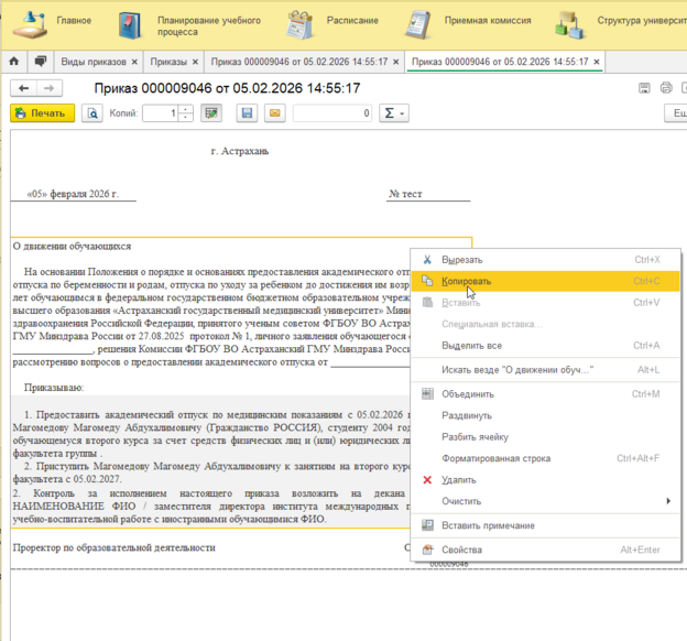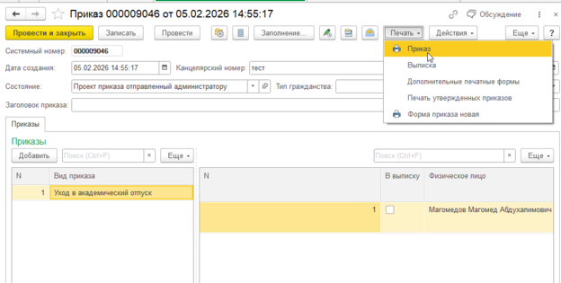 10. В программе "1С:Университет выводим приказ на печать при помощи кнопки "Печатать" --> "Приказ".