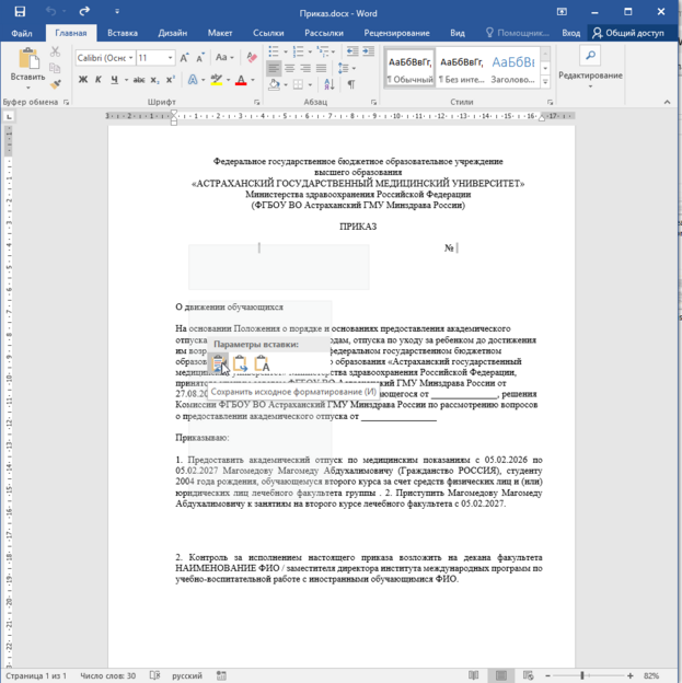 13. Редактируем документ, удаляем и добавляем необходимую информацию и т.д. Дополнительно к подписи проректора по образовательной деятельности никого не пишем. Подпись должна находится на одном листе с текстом приказа.
