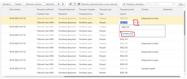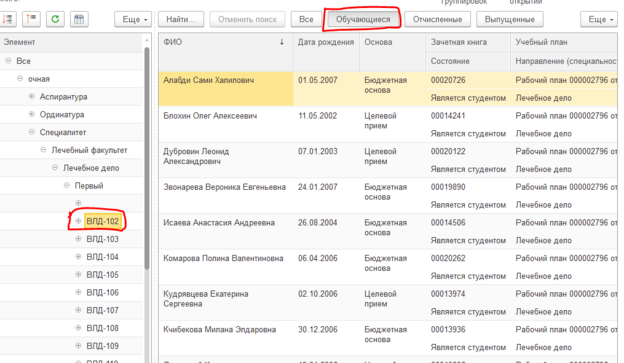 5. В левом верхнем углу нажимаем желтую кнопку "Перенести". В табличную часть выведутся все студенты и их данные
