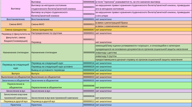 На данной странице представлено соответствии типов приказов, видов приказов и их аналитик.