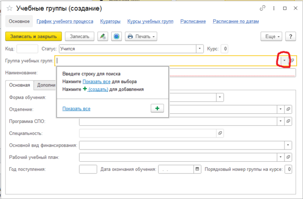 3. В поле "Группа учебных групп" нажимаем на перевернуты треугольник и выбираем "Показать все"