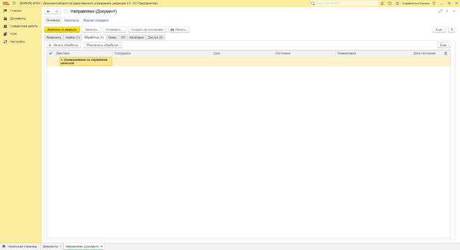 Для отправки служебной записки перейдите в раздел обработка. Если служебная записка отправляеться только адресату то для запуска движения документа нужно нажать "Начать обработку". Пока не будет запущен процесс обработки документ не начнет движение! Если со служебной запиской необходимо ознакомить несколько сотрудников кликните 2 раза левой кнопкой мыши по адресату и откроется окошко где через кнопку "зеленый плюс" можно добавить еще адресатов и им так же отправиться документ для ознакомления.